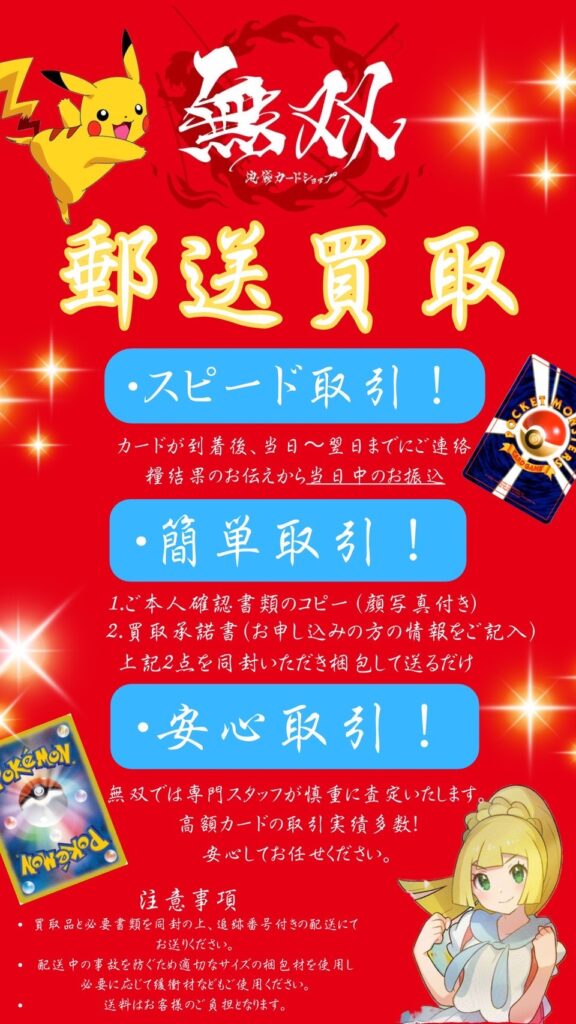 Trading Card 買取査定 Buyback appraisal 査定力に自信があります。市場相場を常に把握し、カード1枚1枚の状態・希少性・需要を正確に見極めます。知識と経験に基づいた、根拠のある査定価格をご提示します。本物のサービスを提供します。ただ高く買うだけではありません。・丁寧で分かりやすい説明・透明性のある価格提示・スピーディーな対応・安心して任せられる接客 販売 Sals 相場に合わせた、適正価格。市場動向を常に分析し、最新の相場に基づいた価格設定を行っています。価値に見合った、納得のいく一枚を。査定力に基づく安心感。真贋判定はもちろん 状態、希少性を考慮した値付けを行っております。 郵送買取も行っております。ご本人確認書類と必要書類を売りたいカードと一緒に送るだけ。 遠方や忙しいお客様にも安心してお売り頂けるよう専門スタッフが慎重に査定いたします。